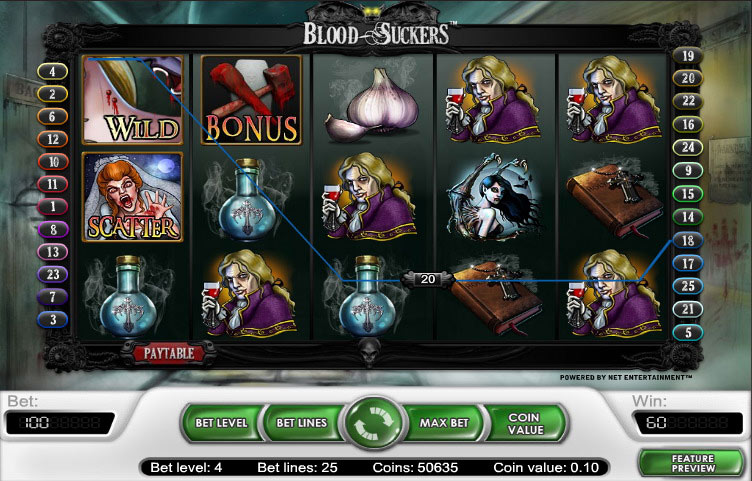Blood Suckers Slot Game is interactive to the Max. It is not one of those slots you put on Auto Spin and set back. There are vampires to kill and flying bats to be aware of. If you are lucky enough to find your self in the dungeon with all the coffins, then you can start having some fun. Drive a stake through the heart of a vampire to win your prize. You will agree the graphics are great, the 10 spins are free and you have 25 bet lines in this Bloody Good Game to choose from.