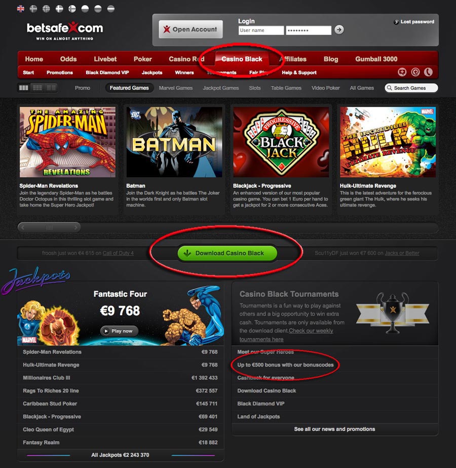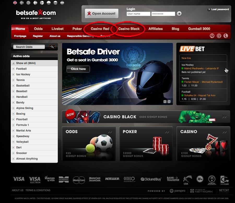 Recently Betsafe has gone all out to please their visitors and players. They now offer a down loadable casino (for Windows) with Cryptologic software and slot games. Just look for the two different casinos on the header menu: Casino Red (NetEnt lsot games) and Casino Black (Cryptologic). There is a really great deal on Bonuses for giving their new Casino Black a spin. It is a 150% to €500… not bad for trying out the new casino.