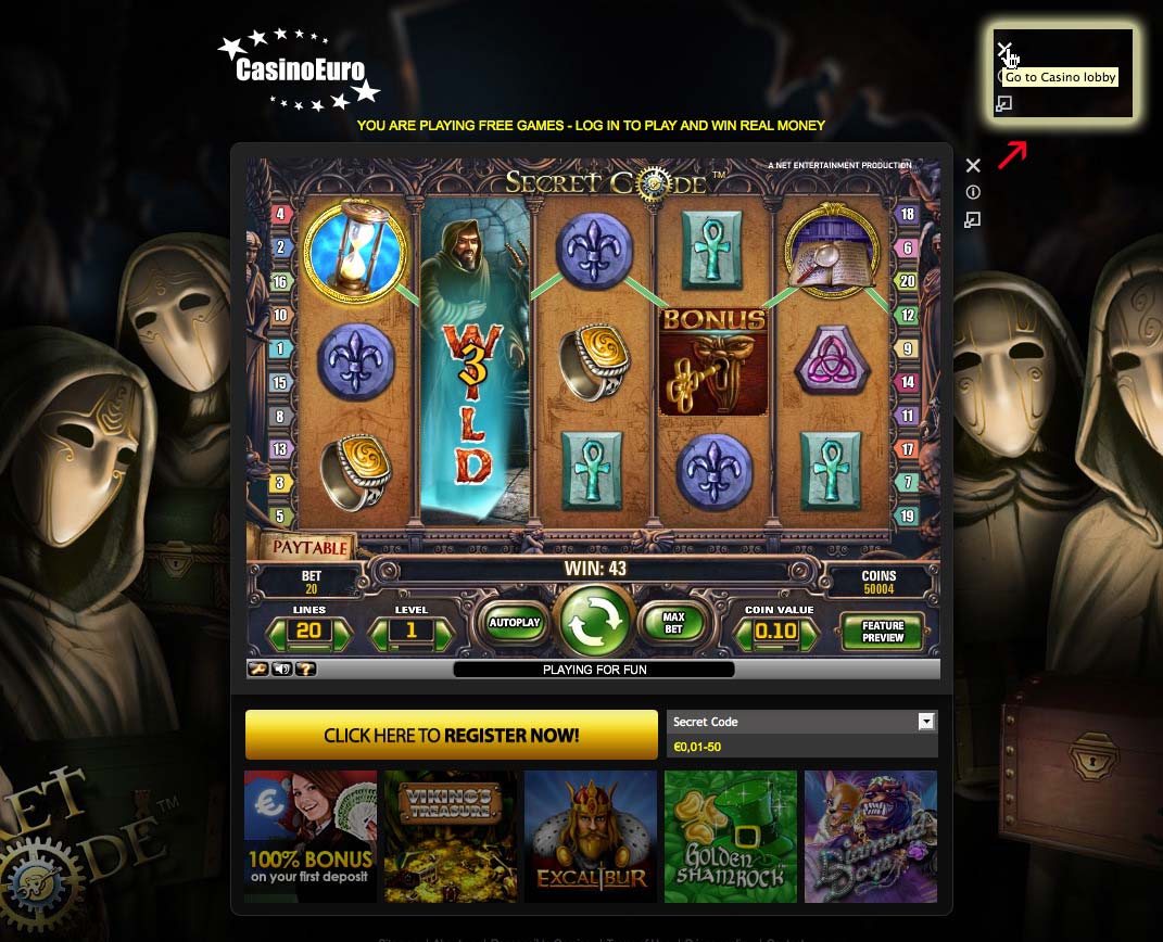 Ok! Now for the good stuff of Mac compatible NetEnt mac slot games at Casino Euro. Net Entertainment, my absolute favorite software for slots. The 3 images above, you me click on to enlarge to 100% full size. The first on the right is a newer release called Secret code. Notice how CasinoEuro has the background behind the mac slot game board 3 dimensionally adorned. Really great effect! This is a recent effect they added to their casino a few months ago. I like it a lot. You can click (upper right on Game board) a tab for full screen. Mostly that is for playing with more than one person at your computer desk or playing with a lap top.