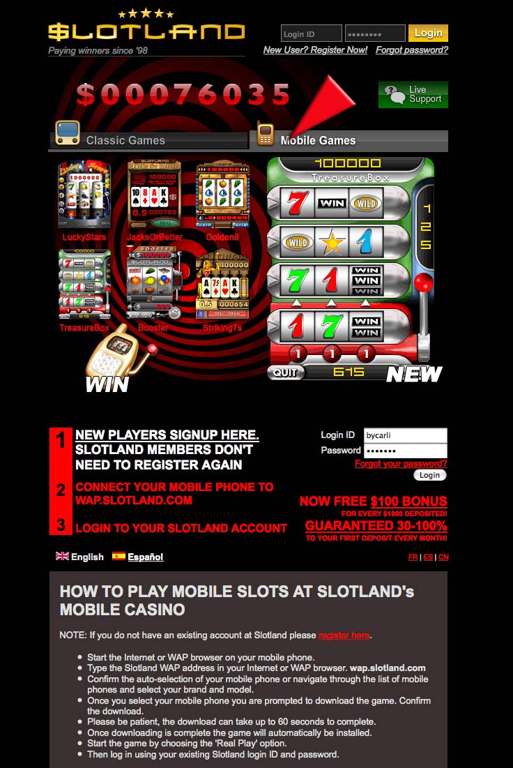 Well I was searching for good 3D casinos to add to the USA mac casino section for Mac-online-slots.com when Slotland casino came to mind. It was a while since I had looked her over. The thing that I did remember about her besides being 100% CALSS-A Mac compatible was the 98% RTP, one of the best in the industry. So I surfed on over for a close inspection. I heard a bunch of good things about this casino from my webmaster buddies. Slotland is NO-download and Mac Compatible, has a 98% RTP, WebTV, MSNTV, AOL, MAC, PC, iPhone, Wii, PS3 and PSP compatible. They didn't have mobile capabilities just a few years ago. So I need to get updated on Slotland for sure.